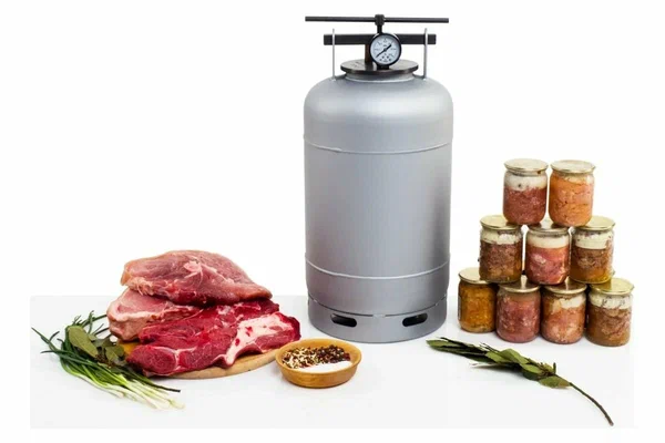 Автоклав для консервирования 24л. Предназначен для стерилизации пищевых продуктов (мясных и рыбных), расфасованных в стеклянные или жестяные банки по 0,5 и 1л. Изготовлен на основе герметично закрывающегося баллона. Одна из двух прокладок УЖЕ установлена в крышку (в специальный канал). Она сливается с крышкой по цвету, но на ощупь другая. Запасная прокладка лежит внутри, в пакете с инструкцией. Принцип его действия – консервация и стерилизация консервов путем нагревания их под избыточным давлением (выше атмосферного). Сверху агрегат плотно закрывается крышкой. Крышка оснащена манометром, который отображает текущее давление в автоклаве, штуцером для накачки и спускания воздуха,предохранительным клапаном для уменьшения излишнего давления при перегреве, который автоматически срабатывает при достижении 5 атмосфер. Устройство имеет выпуклое дно, к которому приварена платформа для банок. Внимание! Агрегат предназначен для использования только на костре, газовой плите или горелке. Инструкция на автоклав для домашнего консервирования предупреждает, что пользоваться им на электроплите категорически запрещено.