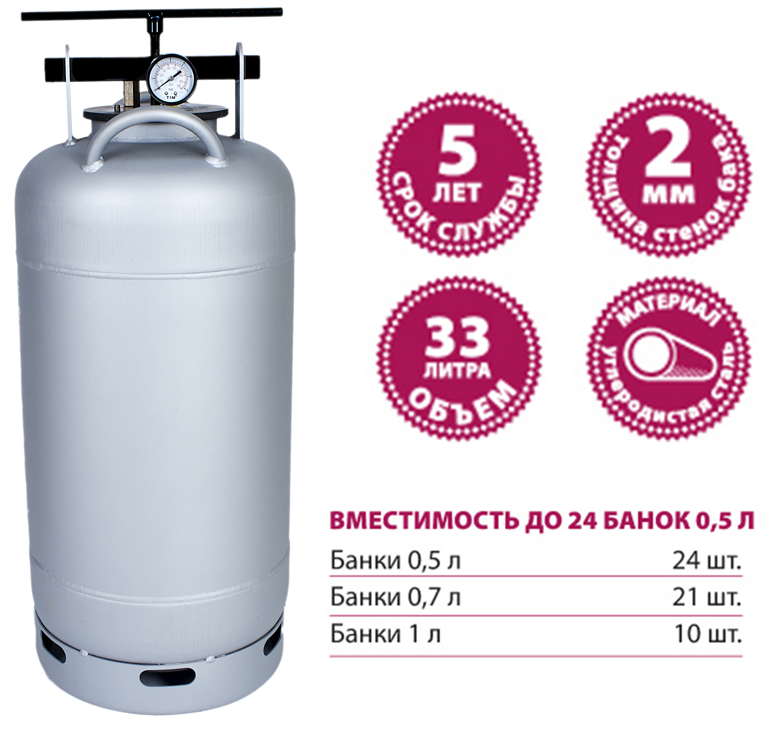 Белорусский Автоклав ТМ Мастерица 33 л имеет 3-кратный запас по прочности, поскольку изготовлен из толстой углеродистой стали.