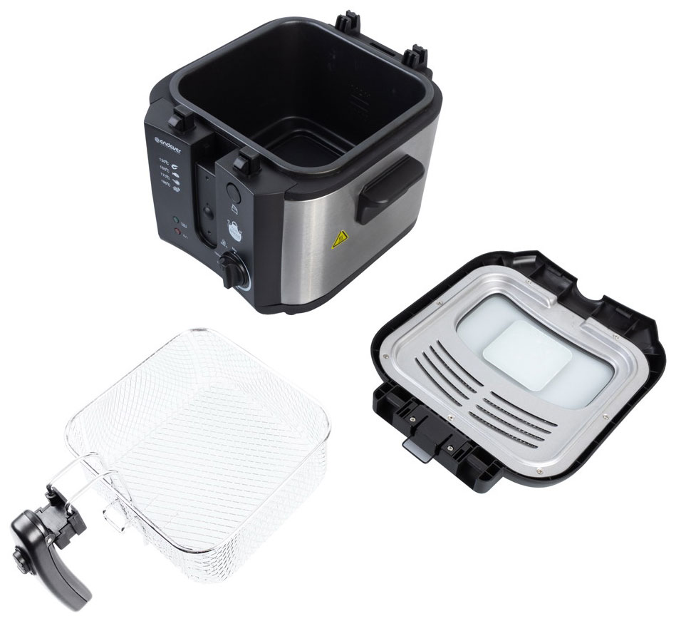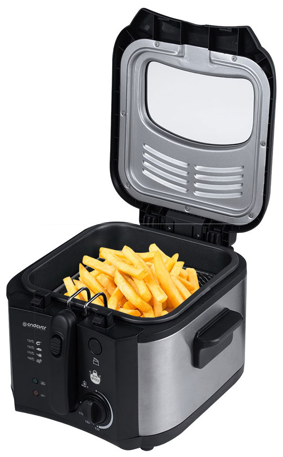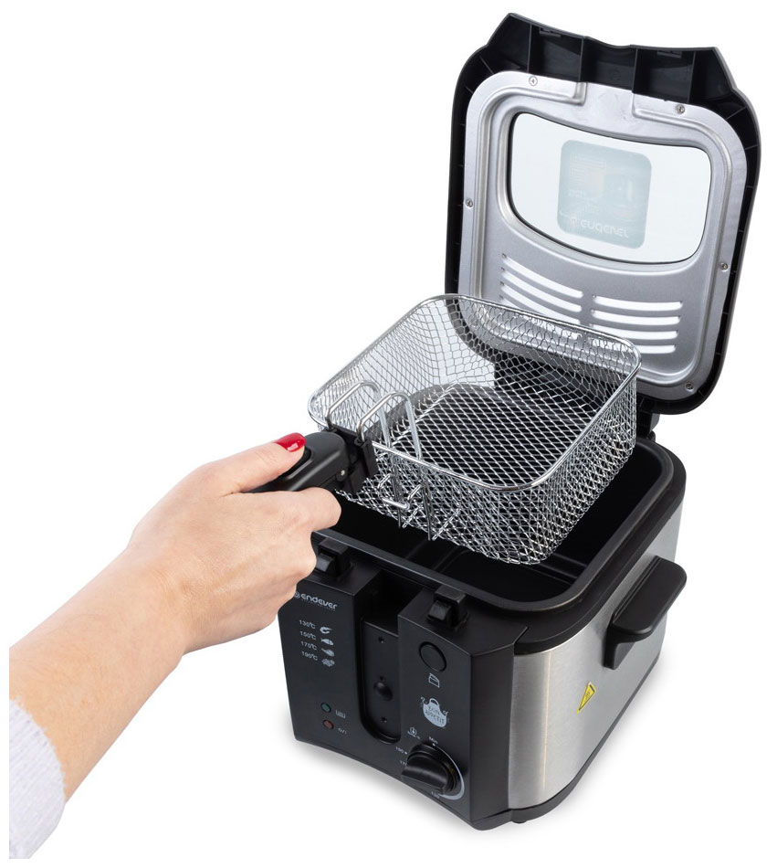 Фритюрница ENDEVER Skyline FR-115 в процессе работы закрывается крышкой со специальным смотровым окошком, через которое можно наблюдать за процессом приготовления, а уникальная конструкция металлических фильтров позволит избежать случайного выплескивания горячего масла. Полную безопасность в процессе приготовления обеспечивает система блокировки крышки. На лицевой панели располагается поворотный переключатель, с помощью которого плавно регулируется температура нагрева. Фритюрница ENDEVER Skyline FR-115 укомплектована съемной корзиной с термоизолированной складной ручкой, чтобы удобно и легко вынимать корзину с готовым блюдом. И корзину, и снимаемую крышку допустимо мыть в посудомоечной машине. Антипригарное покрытие чаши предохраняет продукты от подгорания и позволяет маслу дольше сохранять качество.
