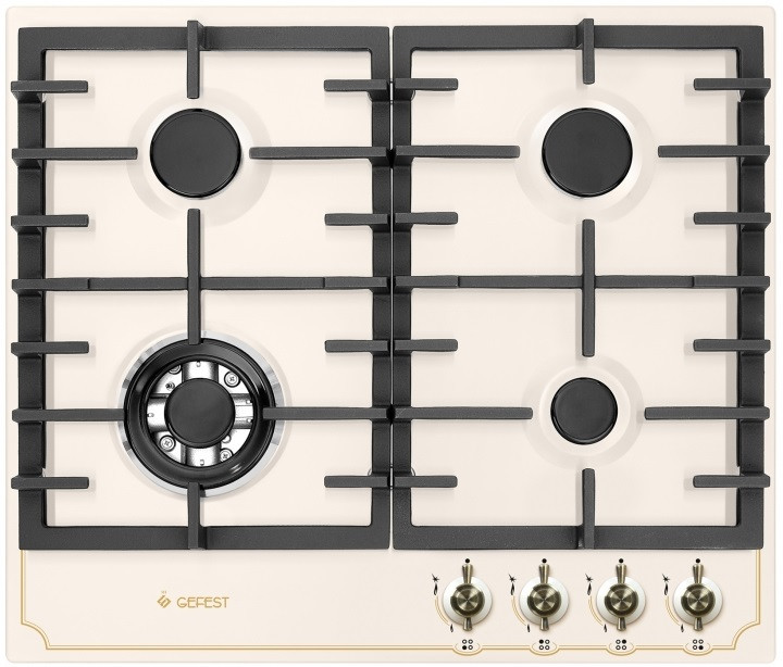 Варочная панель шириной шестьдесят сантиметров, эмалированная поверхность - кремовая, декорирована рисунком в стиле "ретро" и дополнена составными чугунными решетками. На панели управления, расположенной в правой части, размещены поворотные переключатели с интегрированным электроподжигом и фиксированным положением "малое пламя", когда конфорка работает на минимально возможном уровне, без потухания. Все горелки оснащены газ-контролем, две стандартные дополнены малой, экономичной и двухзонной конфоркой, способной к быстрому нагреву и поддержанию необходимой температуры при обжарке.