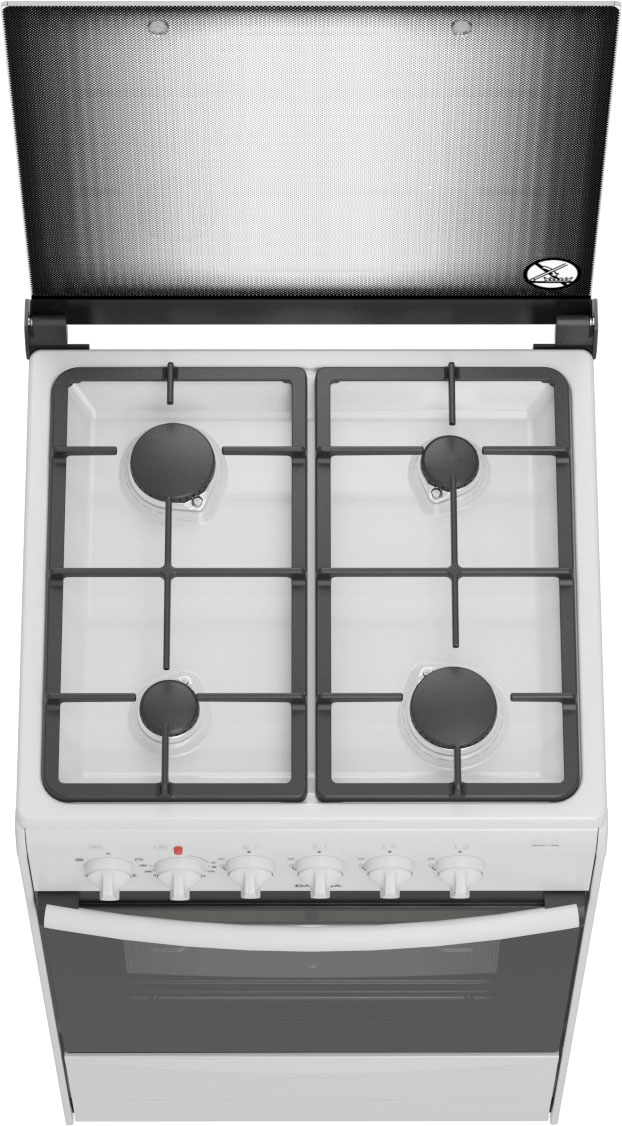 Рабочий стол с четырьмя газовыми горелками различной мощности, решётка стола профильная, выполнена из эмалированного металла. Над рабочим столом плиты установлена крышка из закалённого стекла.