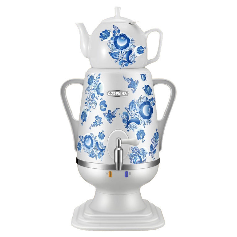 Среди особенностей модели: керамический заварочный чайник со сменным моющимся фильтром из нержавеющей стали в комплекте, хромированный кран, функция термопота, дисковый нагреватель, автоматическое отключение, защита от перегрева и выкипания воды, световая индикация работы.