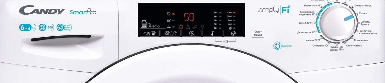 Индикация: Включения, Времени продолжительности программы, Выбор температуры, Выбор сушки, Дополнительное полоскание, Индикатор пара, KG детектор (оптимизация стирки)