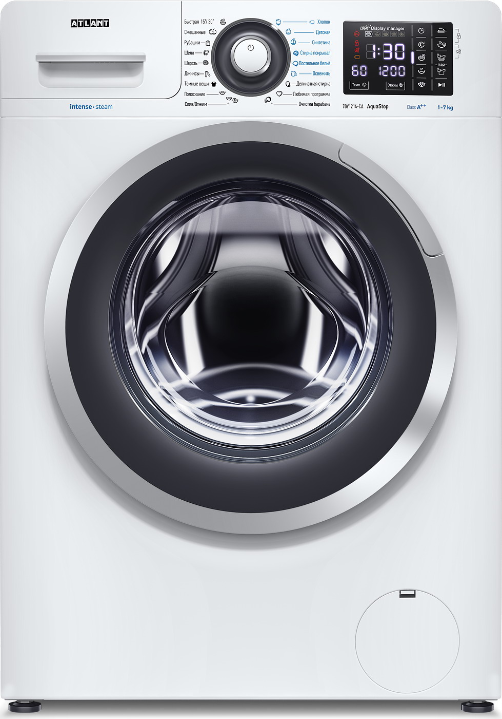 Стиральная машина ATLANT серии INTENSE STEAM с технологией обработки белья паром освежает, дезинфицирует и разглаживает белье благодаря новым режимам, включая программу «Освежить» и паровые опции «Стирка с паром» и «Обработка паром». Сенсорные технологии позволяют легко выбирать функции и программы, а светодиодные индикаторы и сегментный дисплей, расположенные под углом, облегчают восприятие информации. Просторный барабан вмещает значительное количество белья и предлагает множество программ для различных типов тканей. Антибактериальная защита ABG Technology подавляет размножение опасных микроорганизмов на уплотнителе, гребне и лотке для моющих средств. Также предусмотрена система защиты от протечек AQUA-STOP, обеспечивающая защиту как наливного шланга, так и корпуса. Увеличенная гарантия на двигатель составляет 5 лет.