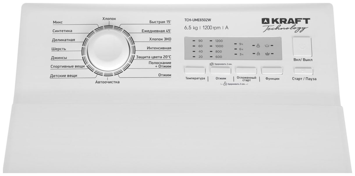 Стиральная машина Kraft Technology TCH-UME6502W с вертикальной загрузкой до 6,5 кг оснащена цифровым дисплеем.