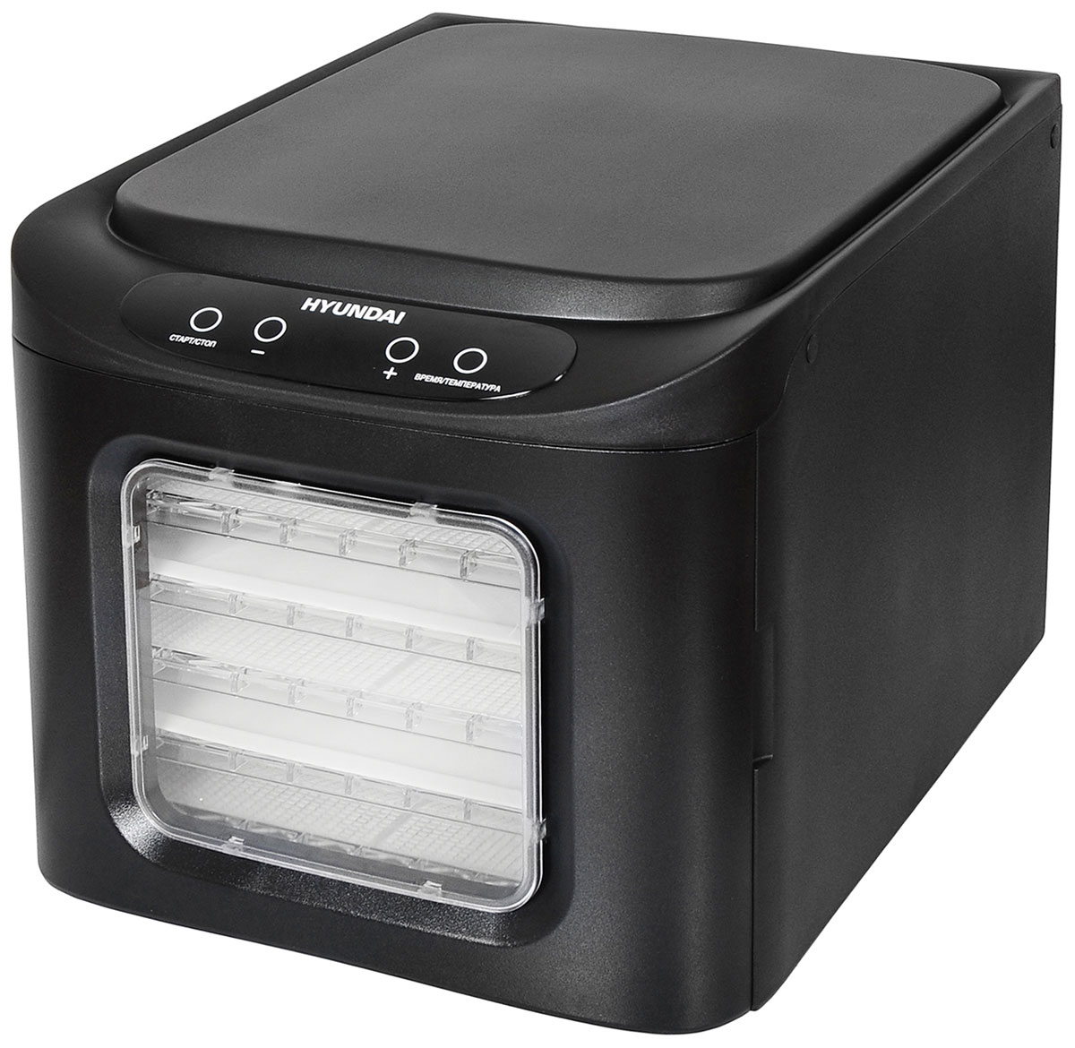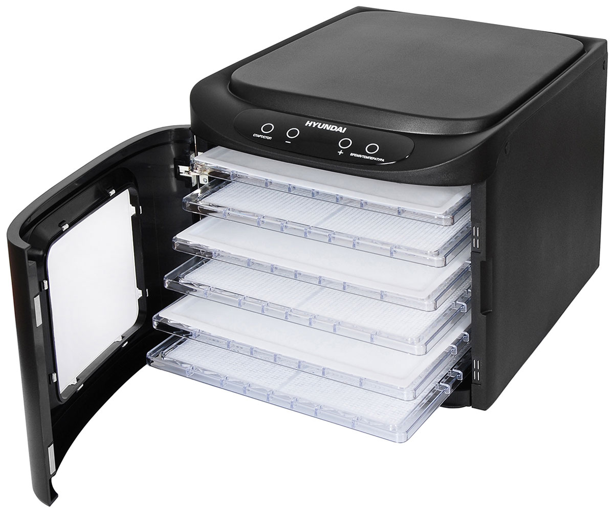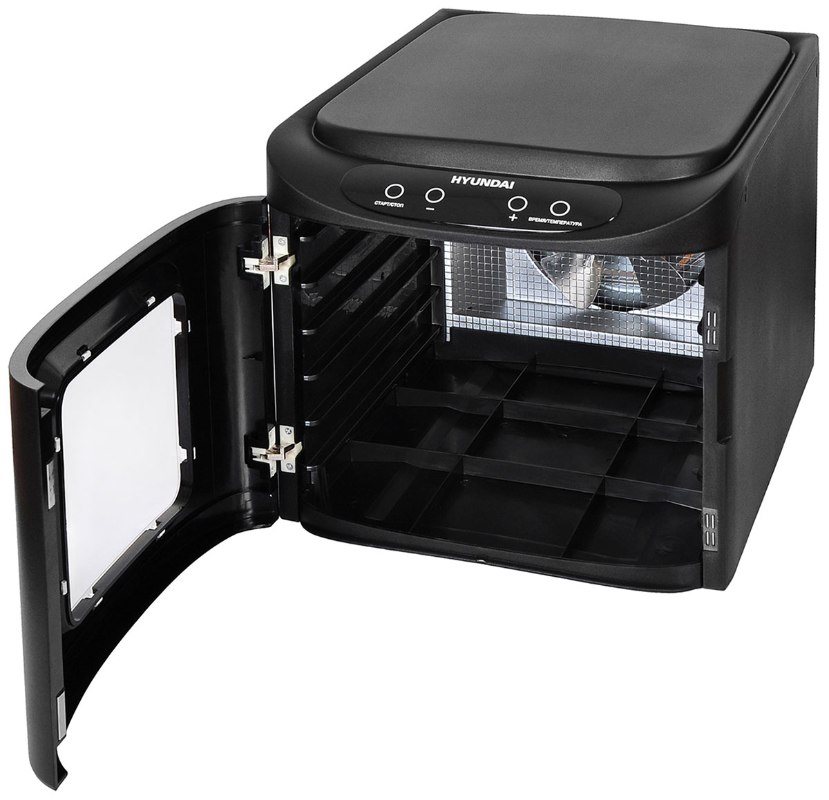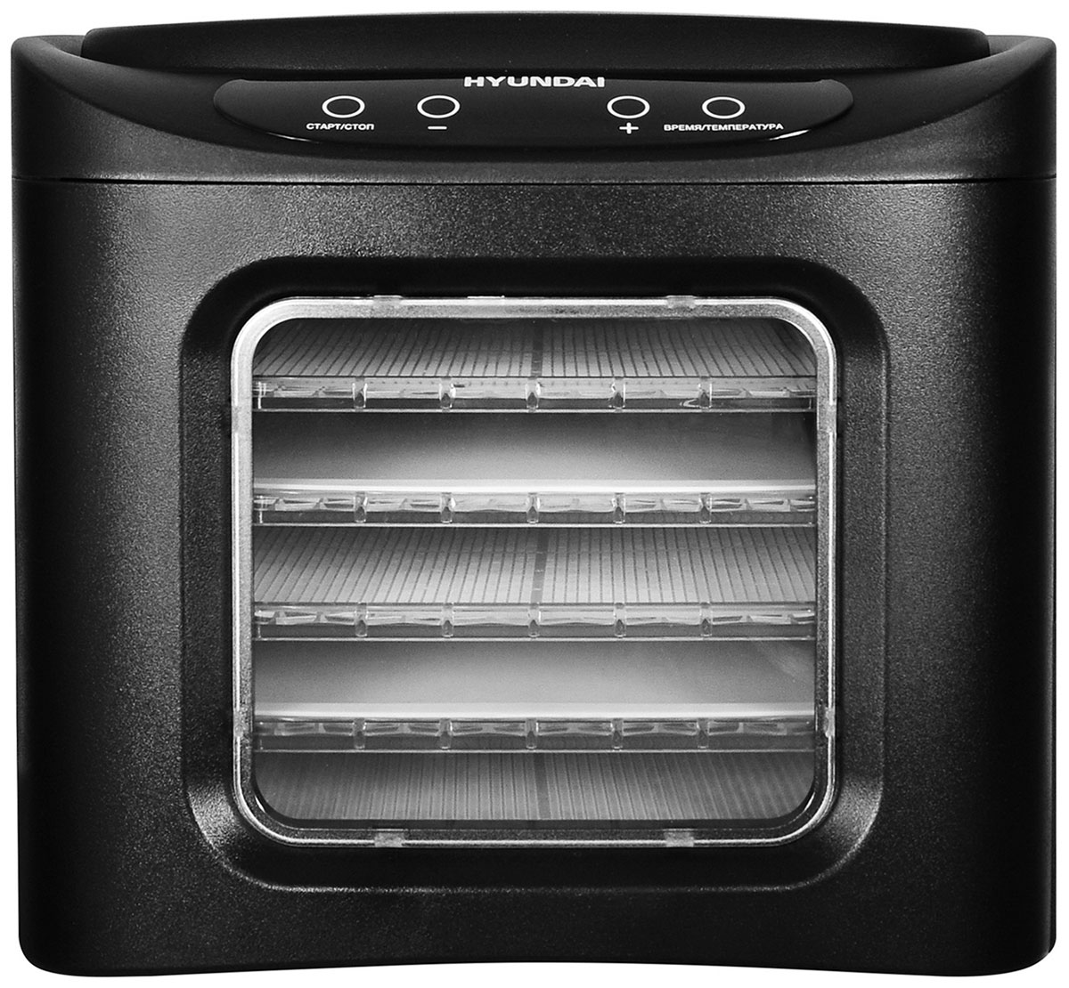 Сушилка для овощей и фруктов Hyundai HYFD-P1203 в черном корпусе, мощностью 500 Вт, имеет 12 поддонов.